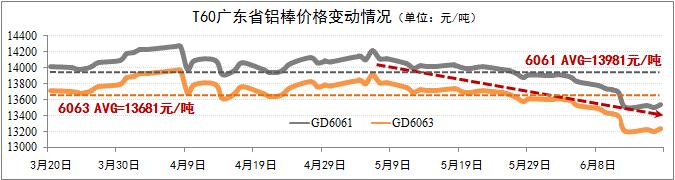 發稿時間:2015-06-17鋁棒現貨價格明顯下浮。截至6月17日,廣東6061棒價格下浮至13545元/噸,6063棒價格下浮至13245元/噸,兩者均低于60天(T60)均價超過400元/噸。鋁棒價格迅速下浮主要受原鋁市場價格下浮的影響。隨著鋁材生產旺季的到來以及鋁材出口的增長,預計鋁棒下浮趨勢于7月初出現溫和反彈,省內6061棒及6063棒的價格回歸至T60均價水平的可能性較大。