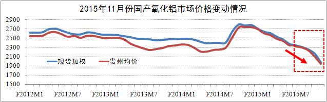 國內價格方面:統(tǒng)計期內,全國氧化鋁市場價格繼續(xù)保持了今年以來的下行趨勢,且下行幅度有所擴大。其中:11月國產現貨加權1985元/噸,環(huán)比下降8.3%,降幅環(huán)比擴大了4.1個百分點;貴州均價1947元/噸,環(huán)比下降7.4%,降幅環(huán)比擴大了1.4個百分點。研究認為,目前氧化鋁市場價格直線下浮屬于異常現象,主要原因是電解鋁做空力量加劇了市場悲觀預期。