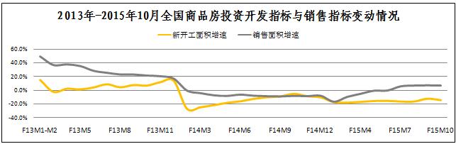 發(fā)稿時間:2015-11-20全國市場方面:國家統(tǒng)計局數(shù)據(jù),10月份全國商品房新開工面積累計同比降幅為-14.7%,跌幅環(huán)比擴大2.1個百分點,銷售面積累計同比增速為7.2個百分點,增幅環(huán)比下跌0.3個百分點。10月份全國房地產(chǎn)投資開發(fā)指標與銷售指標表現(xiàn)不佳,拖累國房景氣指數(shù)連續(xù)兩個月下跌,其中10月份國房景氣指數(shù)為93.34,較9月份下跌了0.06點。