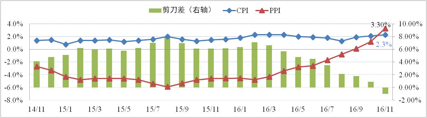 據(jù)國家統(tǒng)計(jì)局?jǐn)?shù)據(jù)顯示,11月份CPI指數(shù)同比上漲2.3%,環(huán)比上升0.2個(gè)百分點(diǎn);PPI指數(shù)創(chuàng)5年來新高同比上漲3.3%,環(huán)比上升2.1個(gè)百分點(diǎn)。雖然CPI、PPI同步上漲,但PPI的漲幅明顯高于CPI,說明物價(jià)上漲主要集中在上游原材料行業(yè),而中下游行業(yè)由于終端需求疲軟被迫承受來自上游成本壓力。