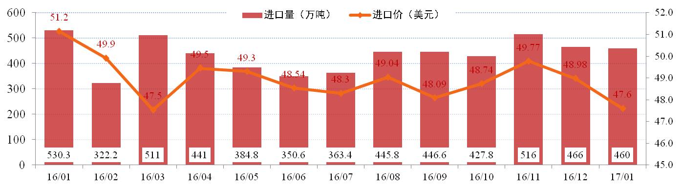 進口量方面:根據進口海關數據顯示,2017年1月我國進口鋁土礦460萬噸,同比下降11.74%,環比微降1.39%。當月澳洲、幾內亞、馬來西亞等主要國家供應基本穩定。