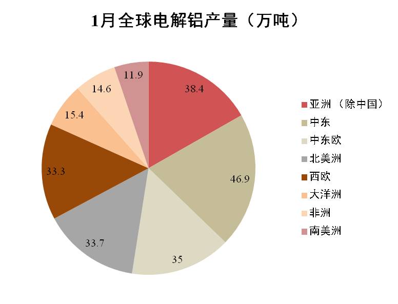 數據顯示,1月全球(除中國)原鋁產量環比微增0.1%至229.2萬噸。當月日產量由12月的7.383萬噸增至7.393萬噸。預計2月份全球產量因生產天數減少出現下滑,但受印度新增產能和大洋洲復產的拉動,日產量將繼續增長。