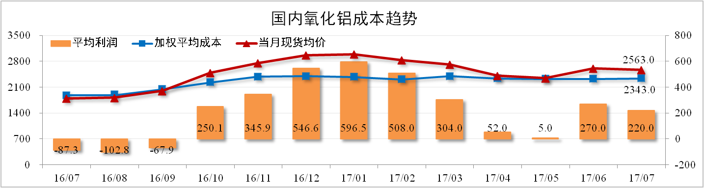 分析認為:高煤價刺激煤企有效產能快速釋放,隨著高溫天氣接近結束,下游需求放緩,預計煤價在8月末有所下滑;環保督查影響短期內不會減弱,鋁土礦、片堿供應緊張仍具上漲動能。預計8月份氧化鋁生產成本保持穩定。