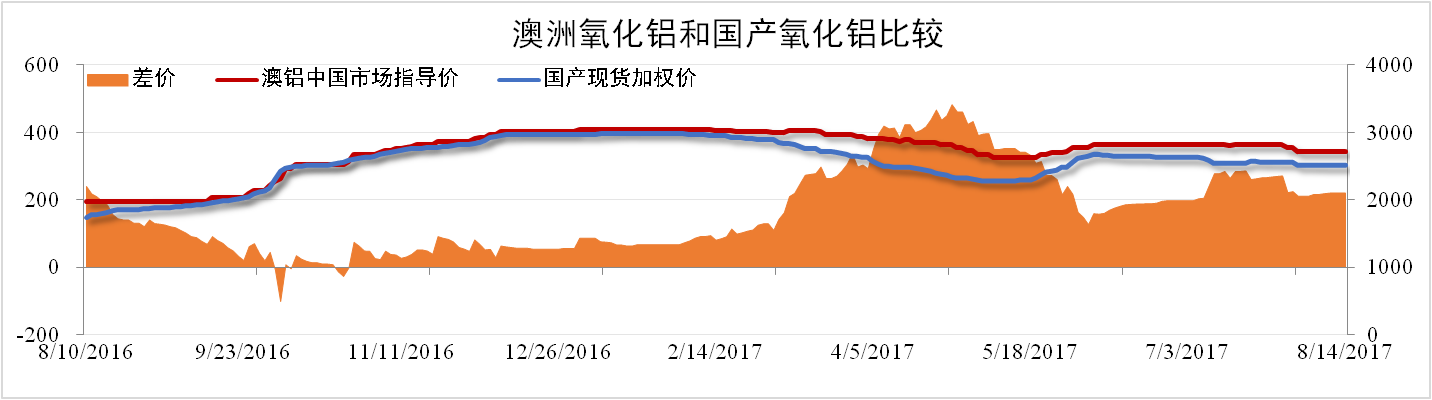 由于澳洲氧化鋁價格與國產氧化鋁價差偏高,因此澳洲進口氧化鋁價格開始走低。截止7月31日,澳洲氧化鋁中國市場指導價為2,775元/噸,環比下跌1.77%,國內氧化鋁加權價格2,549元/噸,價差縮小至226元/噸。