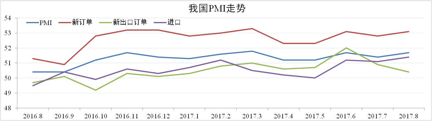 8月份我國制造業PMI為51.7,較上月上漲0.3,處于擴張區間。分項中,生產自53.5上升至54.1,新出口訂單自50.9下降至50.4,進口訂單自51.1上升至51.4,主要原材料購進價格自57.9大漲7.4個百分點至65.3。