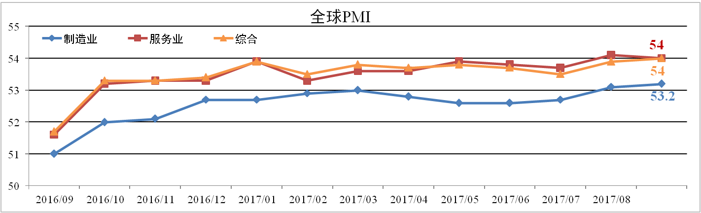 據HIS Markit與摩根大通發布的數據顯示,9月份全球綜合PMI為54,較8 月擴大0.1個百分點。其中服務業PMI為54,較上月下降0.1個百分點,制造業 PMI為53.2,均較上月擴大0.1個百分點。