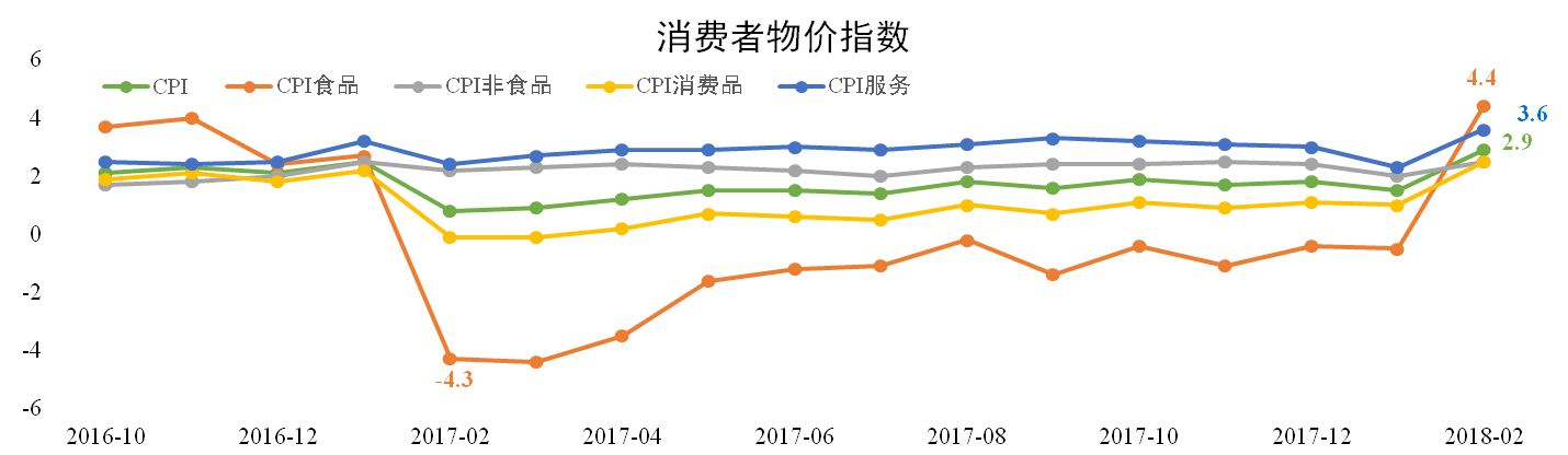 受春節錯位影響,食品價格同比大幅上升,拉動CPI上揚。據統計局數據,2月份我國CPI同比為2.9%,較上月擴大1.4個百分點,為2013年11月以來的最高值。主要分項均有不同程度上漲,其中食品同比上漲4.4%。