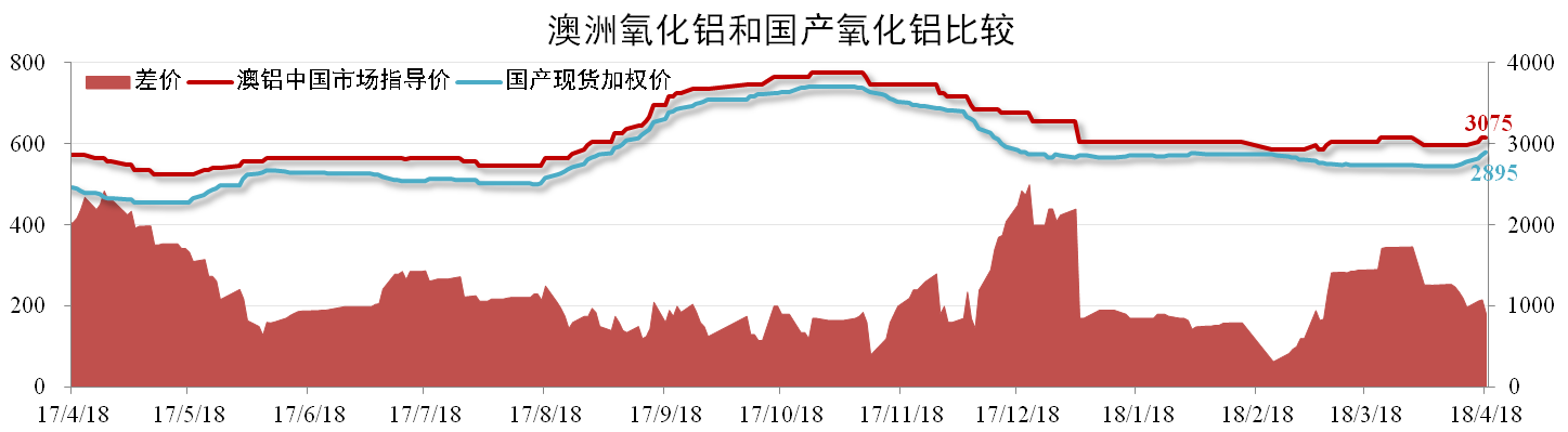 截至4月18日,國產氧化鋁現貨加權均價為2895元/噸,同比上升18.03%,環比上升5.82%。澳鋁中國市場指導價為3075元/噸,環比上升1.65%,二者價差180元/噸,較上月同期縮窄109元/噸。
