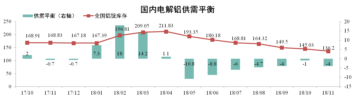 據(jù)阿拉丁數(shù)據(jù),11月原鋁產(chǎn)量301萬噸,凈進口1萬噸,總供應量為302萬噸,消費量為306萬噸,當月理論供應短缺4萬噸。11月底全國鋁錠庫存136.2萬噸,環(huán)比下降6.09%。