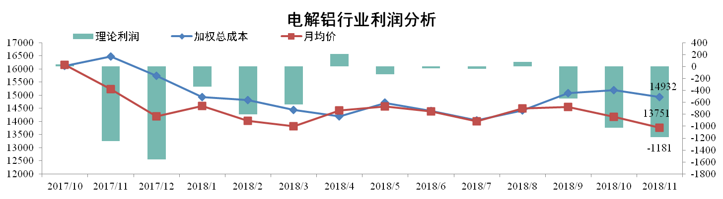 11月份電解鋁行業(yè)加權平均成本為14932元/噸,環(huán)比上升0.78%。同期國內(nèi)現(xiàn)貨均價報13751元/噸,環(huán)比下降2.98%。行業(yè)理論利潤為虧損1181元/噸。