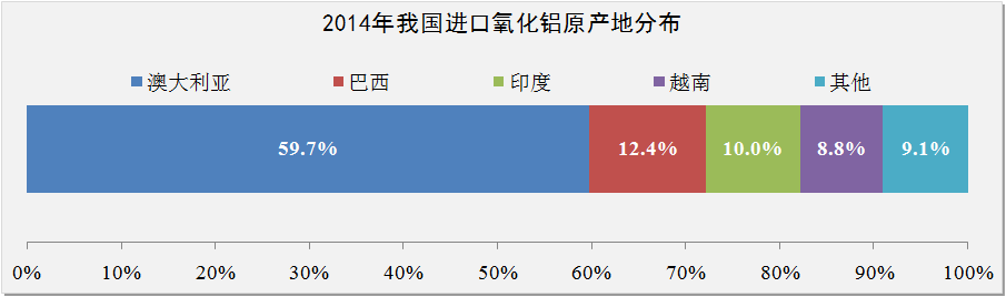 進口方面。2014年度我國進口氧化鋁共528萬噸,進口同比增長37.7%。從原產地上看,全年最大進口國仍為澳大利亞,進口氧化鋁占比59.7%;前四位原產地氧化鋁進口占比高達90.9%。進口價格方面,全年進口氧化鋁均價為382.34美元/噸,折合人民幣均價2343元/噸。