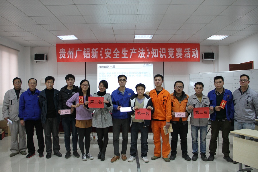 為深入宣傳貫徹國家頒布的新《安全生產法》,增強廣大員工紅線意識,促進企業安全生產,2014年12月24日下午14:00時,貴州鋁業公司黨支部、工會、安環處共同組織開展了新《安全生產法》知識競賽活動。此次活動在貴州鋁業公司綜合辦公樓五樓黨員活動室舉行,公司總經理、工會主席、安環處處長、財務處長等領導到場觀看了比賽。